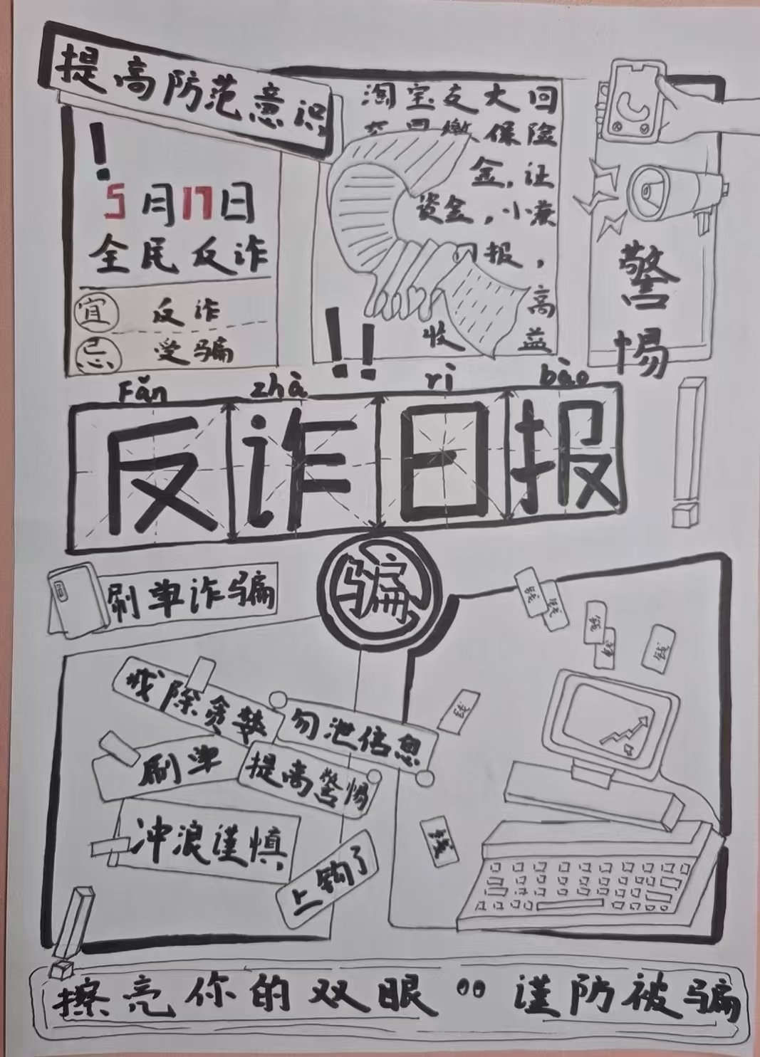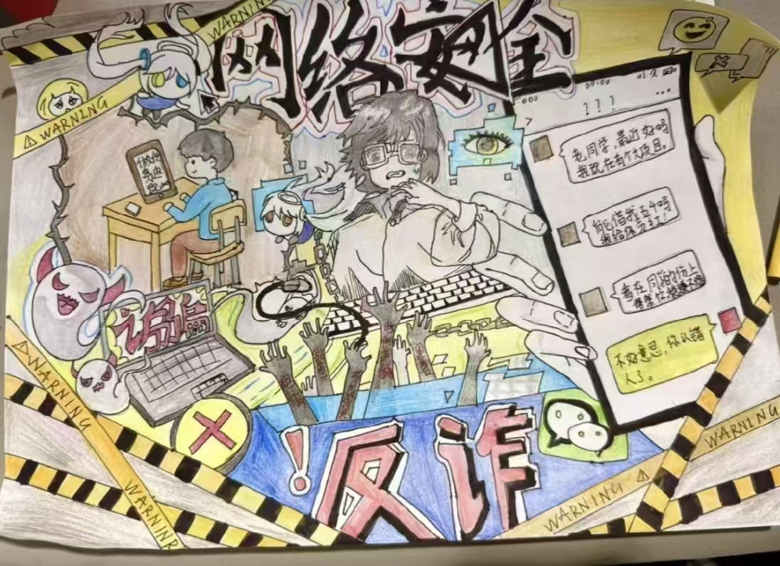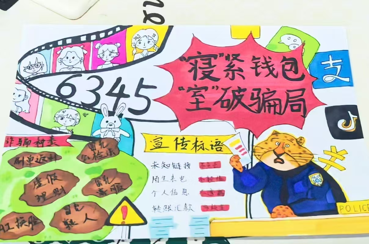 本次活动形式多样、内容贴近学生实际,吸引了英国上市公司365各宿舍踊跃参与。在“宿舍反诈手绘海报”环节,同学们结合冒充好友、刷单返利等常见诈骗手法,巧妙融合宿舍生活场景与反诈知识,创作出一幅幅主题鲜明、警示性强的手绘作品;在“反诈徽章与标语设计”环节,同学们制作出独具特色的反诈主题徽章,并配以反诈标语。“宿舍反诈微电影”创作也是本次活动的亮点之一,同学们以宿舍为拍摄场景,自编自导自演,围绕学生生活中可能遇到的高频诈骗案例,创作防诈短剧。同学们在参与中学习,在创作中警醒,切实提升了识别和防范诈骗的意识和能力。
