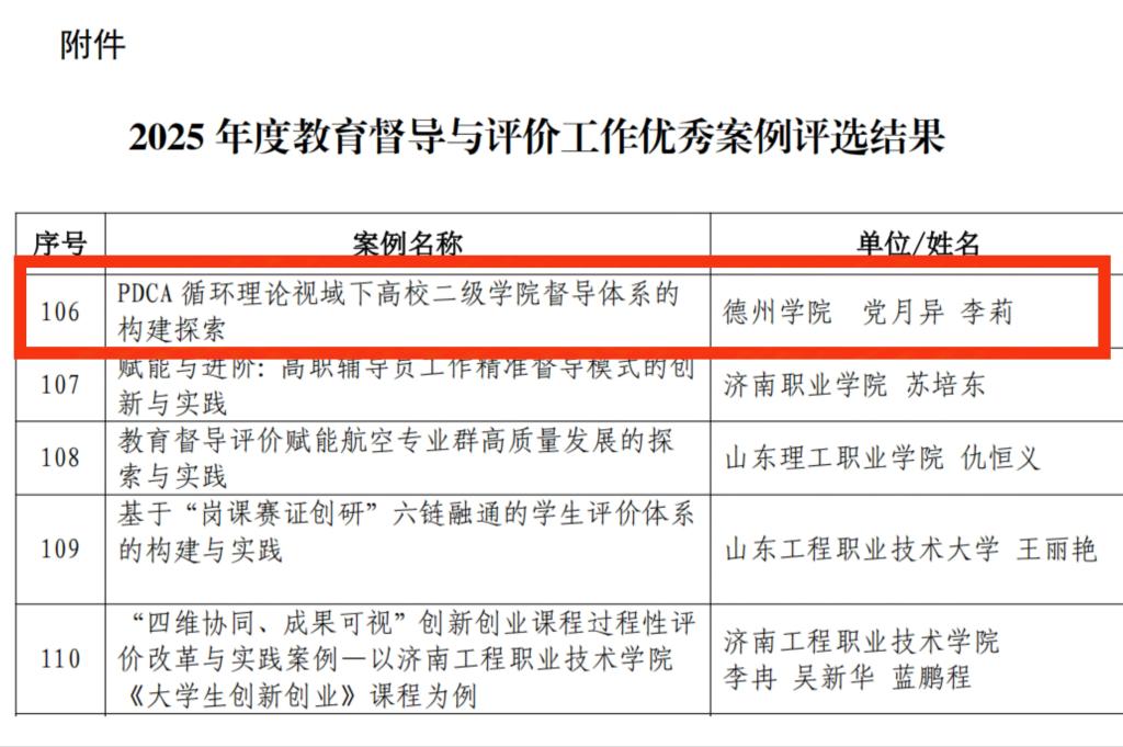 近日,山东省教育督导学会发布《关于公布2025年度教育督导与评价工作优秀案例评选结果的通知》(鲁教督会字〔2026〕2号),经资格审查、专家评审和评委会会审,我院党月异与李莉2位老师共同完成的《PDCA循环理论视域下高校二级英国上市公司365督导体系的构建探索》案例成功入选优秀案例,彰显了英国上市公司365在教育教学督导体系建设与改革创新方面的扎实成效。