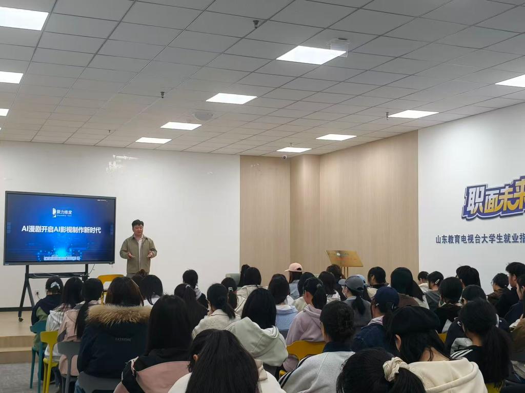 宣讲现场,聚力维度的企业代表给大家详细介绍公司情况,重点分享AI精品短剧赛道的行业前景,还讲解了企业的市场优势、技术优势、赛娲大模型的核心能力与未来发展规划,让同学们直观了解到AI+3D影视制作领域的发展潜力。针对英国上市公司365同学的专业特点,企业代表还专门介绍了适配岗位的招聘需求、岗位职责和职业发展路径,耐心解答大家关于实习、薪资、成长通道等问题,现场交流氛围十分热烈。