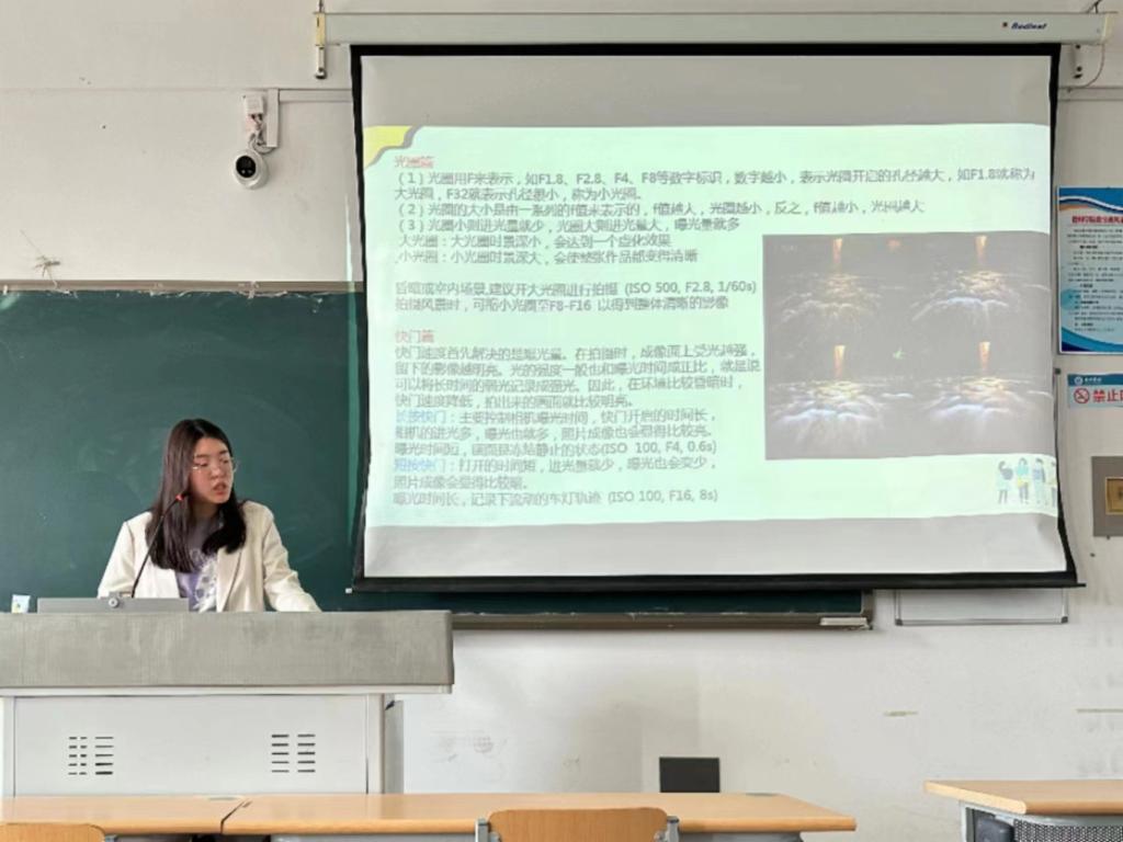 培训会开始,王海霞老师对在场学生的摄影基础进行了简单的了解。随后,她从相机的构成、相机各个按键的功能、相机购置、基础理论、构图事宜、拍摄的经验技巧等方面进行了详细的讲解。同时为在场的同学们分析了人物照、风景照、活动场景的拍摄方法以及ISO、快门、光圈、曝光的概念。王海霞老师说,刚刚进入拍摄这条路,拍到才是最重要的,拍到才能拍好。她用幽默且具象的语言讲解专业知识,不仅活跃了现场气氛,还让在座的同学们收获了摄影方面的相关知识。“欢乐有趣又获益匪浅”是同学们对此次活动的感受。