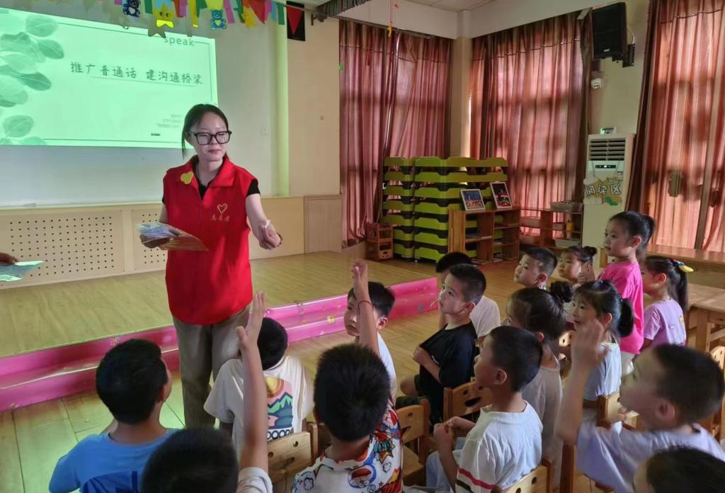为更好地传承弘扬中国传统文化,推广普通话,营造良好的语言学习环境,“推普助力乡村振兴”服务队依托汉语言文学专业的知识背景,建立推普知识小课堂,进行诗歌朗诵,汉诗文吟诵等活动,结合幼儿园小朋友们的知识储备能力,开展普通话能力专项培训活动,活动中让小朋友们在模拟情境中学习常用礼貌用语,让小朋友们感受说普通话的作用,学习基本的文明用语,并在日常生活中运用、巩固;在童谣中渗透讲好普通话的思维,让小朋友们在童谣中感知普通话的作用及便利,与小朋友们一起唱童谣,小朋友们在活动中树立学好普通话、多讲普通话的意识,养成文明使用普通话的习惯;通过做一些小游戏,让小朋友们更加具体的感知普通话,让每个小朋友读一段简短的短文,纠正他们的发音,并适当地给小朋友们一定的奖励,以此来激励他们更加的地注重普通话的使用。