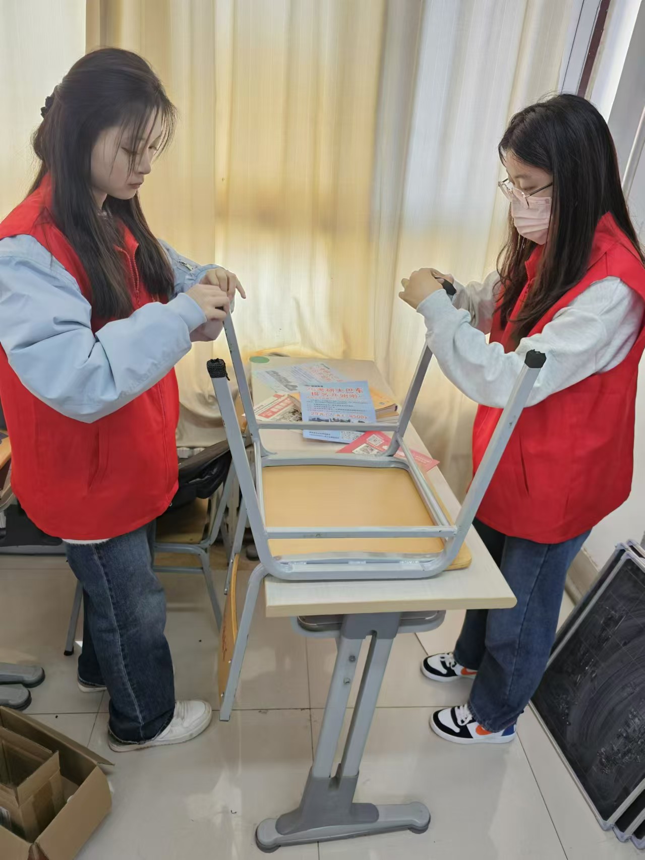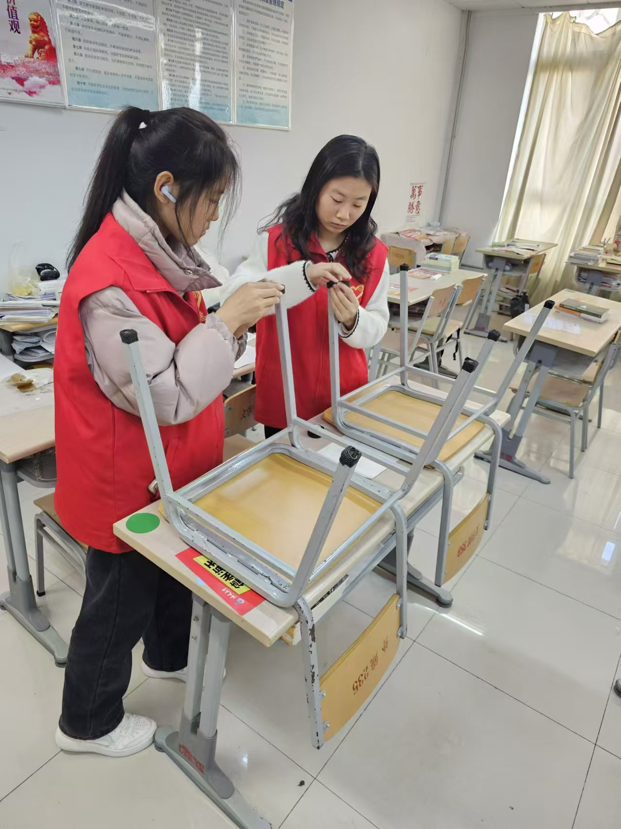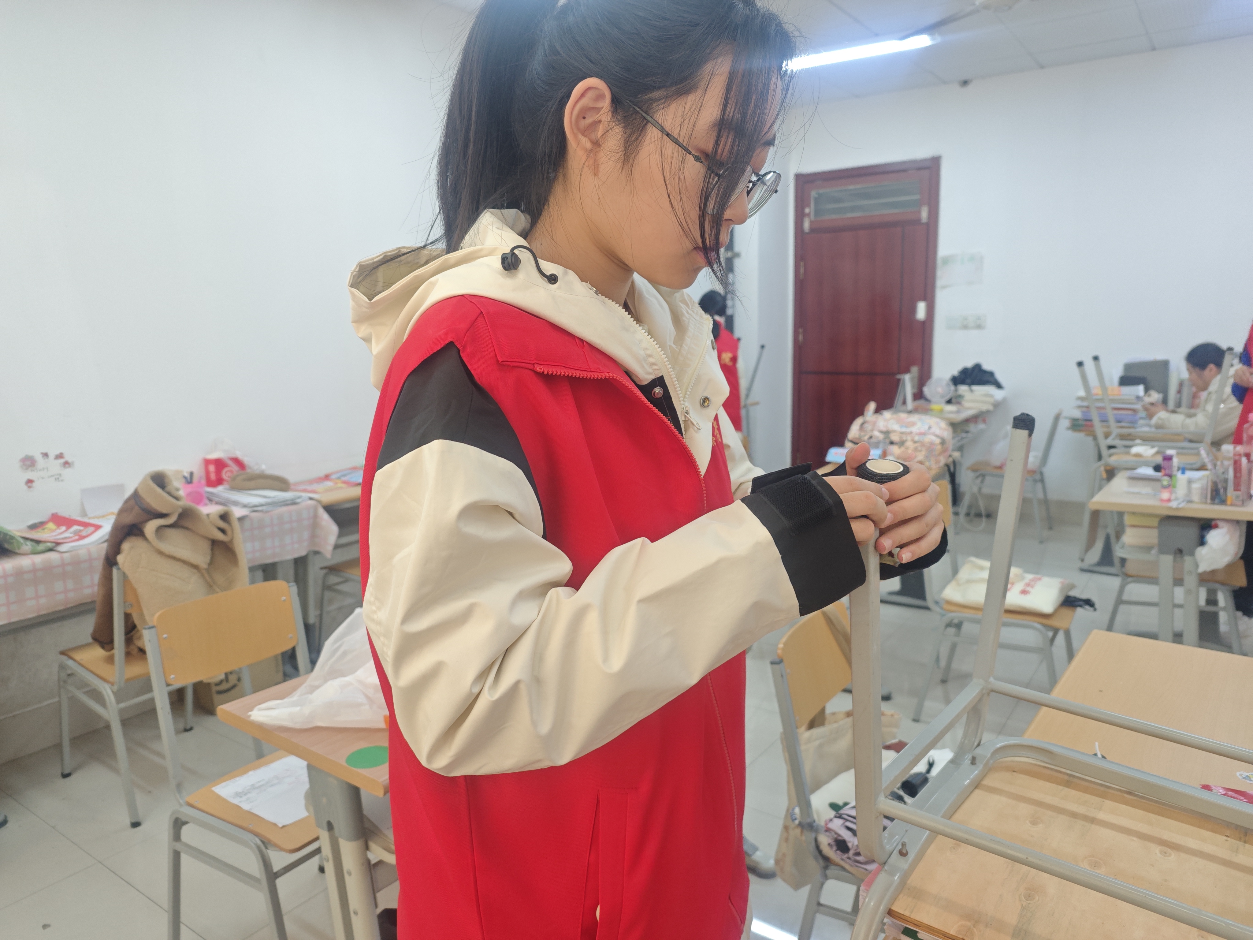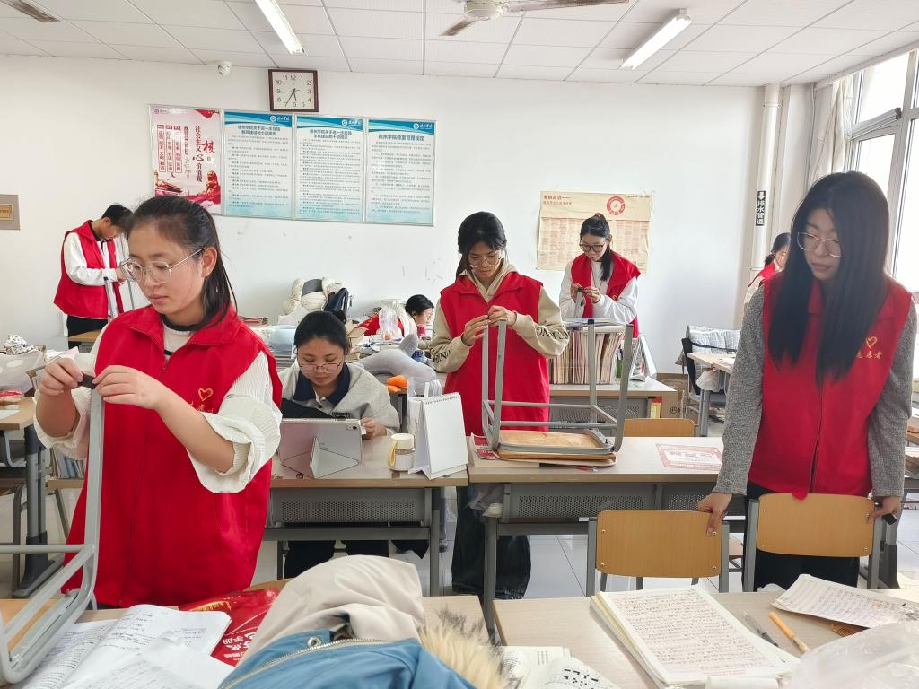 志愿者团队针对考研学生反映的考研教室开关门时发出噪音的问题,为教室门涂上了润滑油,使门部件变得更加顺滑,有效降低了关门时发出的刺耳声音。此外,志愿者们还为教室内的桌椅粘贴上了静音防滑垫,减轻了拉动桌椅时产生的声音,为考研学子提供了一个更加安静的学习环境。这些举措不仅有利于帮助考研学子提升学习的专注度,提高学习效率,也能够缓解考研学子的心理压力,让他们在学习之余能够更好地放松身心,以更加积极的心态面对备考过程中的困难与挑战。