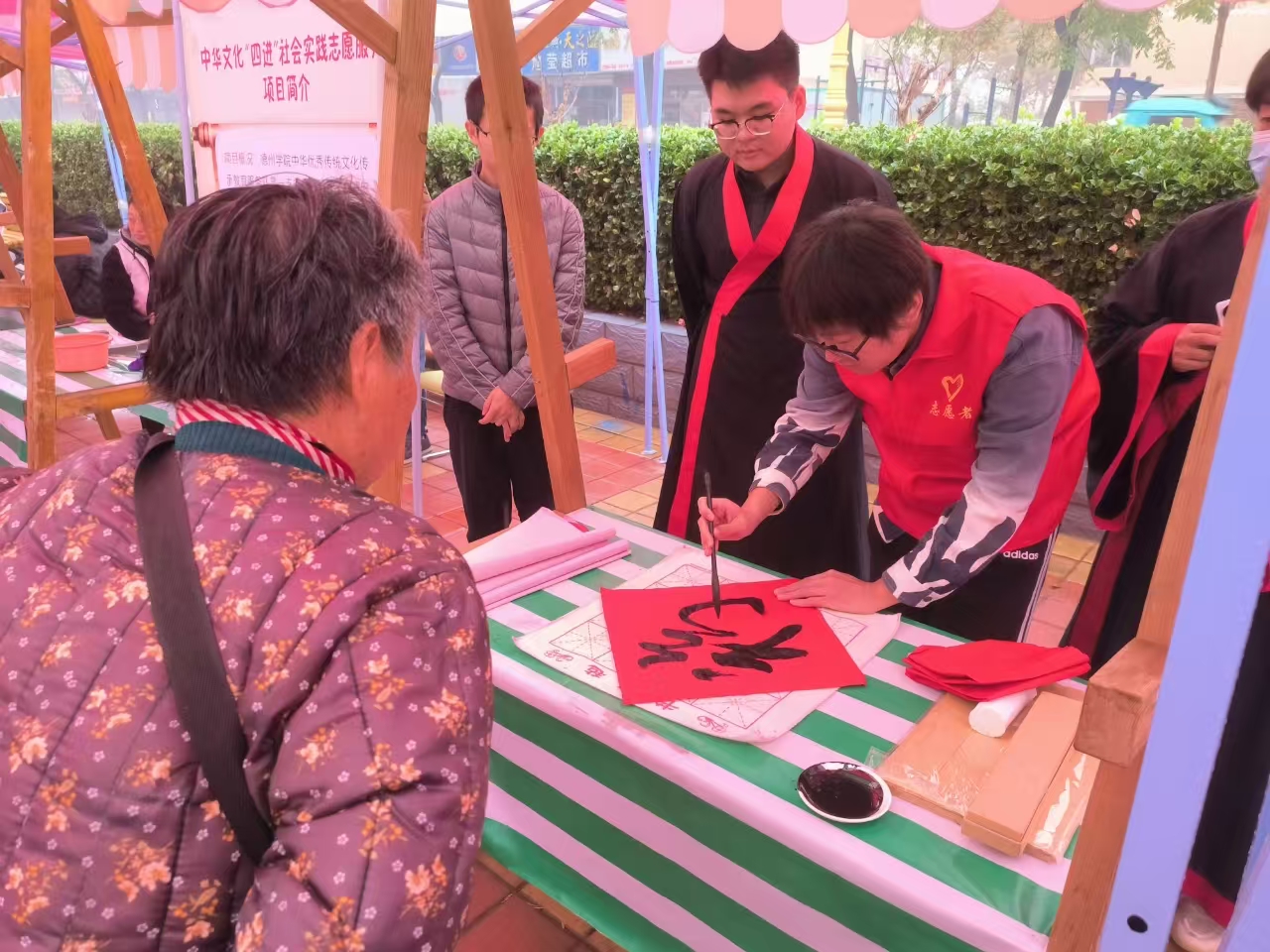 活动伊始,同学们首先为社区居民吟诵了《诗经》中的名篇《卫风·木瓜》:借此向居民传达了珍重情意永相好的美好愿望,“投我以木瓜,报之以琼琚。”高亢嘹亮的嗓音和充满活力的表演成功赢得了社区居民的阵阵掌声,连绵不绝。吟诵表演完毕后,同学们还为社区居民进行了书法展示,同学们凭借精湛的书法技艺在一张张红纸写下一个个“福”字,并免费赠与社区居民,寓意“福荫庇护,心想事成”。此举不仅帮助社区居民进一步感受到了书法文化的博大精深,更烘托渲染出英国上市公司365的传统文化氛围和人文关怀,获得了社区居民的一致好评。
