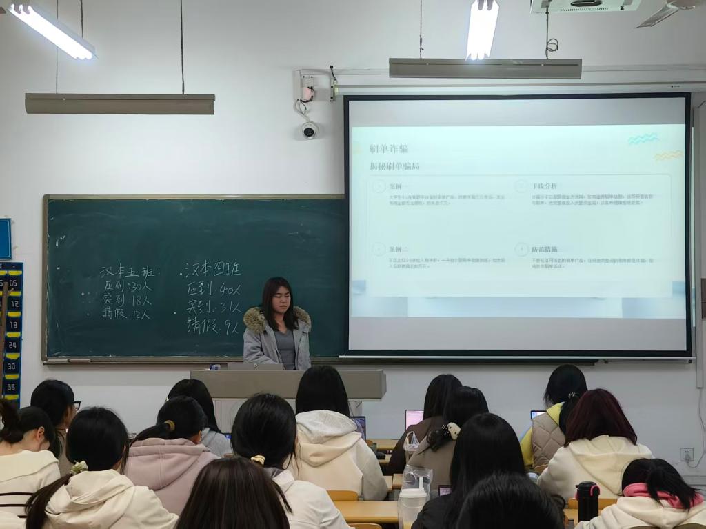 班会中,宣讲人播放了校园反诈真实案例视频,呈现刷单返利、非正规网贷陷阱、账号租赁等学生容易受骗的场景,帮助学生直观识别诈骗套路;现场指导学生管理手机应用权限,讲解如何识别涉诈软件“过度索取通讯录或定位权限”等特征,引导学生完成个人设备的初步风险排查并做好记录。本次主题班会现场专注度高、互动感强,同学们积极咨询操作细节,相互协助,形成了浓厚的反诈学习氛围。