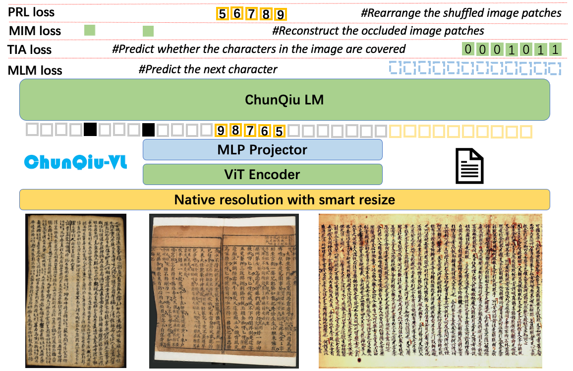 “春秋”模型采用ViT-MLP-LLM三阶段架构,在预训练阶段引入自回归语言建模、图像掩码、图文细粒度对齐及图像块排序四类损失函数,实现跨模态对齐学习;下游任务阶段,通过版面元素分析、文本行检测、文字识别、视觉问答、遮掩补全等八类指令微调,显著提升了古籍复杂版面的解析与识别精度。实验结果显示,该模型在SCUT-CAB、MTHv2、M5HisDoc、AncientDOC等公开数据集上的版面分割、文字识别、阅读顺序判定等任务中,主要指标均达到现有最优方法,字符识别准确率最高达98.98%。