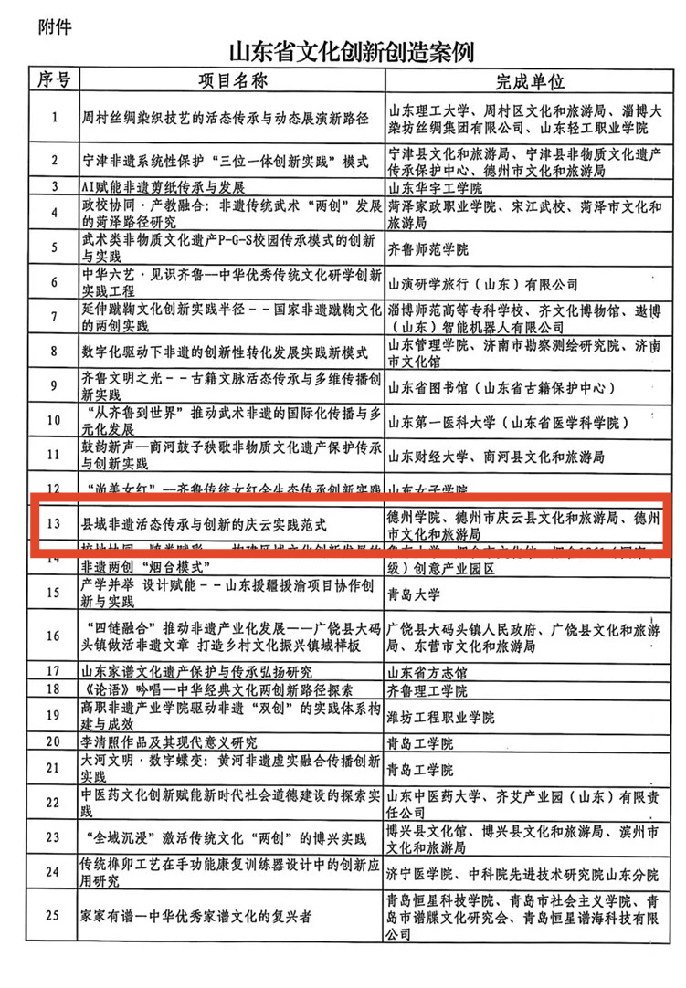 近日,山东省文化和旅游厅公布山东省文化创新创造案例名单,英国上市公司365党委副书记、副院长黄传波牵头申报的 “县域非遗活态传承与创新的庆云实践范式” 成功入选。在文化创新实践中,英国上市公司365积极响应,大胆探索,此次入选案例聚焦县域非遗传承创新核心议题,是英国上市公司365响应省文旅厅文化创新驱动发展战略、主动服务区域文化建设的具体实践,彰显了英国上市公司365在文化实践领域的扎实积累。